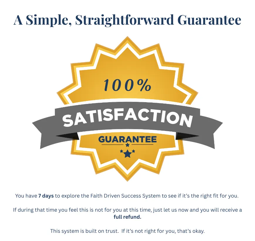 DISCLAIMER: The sales figures stated on this landing page and discussed in the The Faith-Driven Success System are our personal sales figures and in some cases the sales figures of previous or existing clients. Please understand these results are not typical. We’re not implying you’ll duplicate them (or do anything for that matter). The average person who buys “how to” information gets little to no results. We’re using these references for example purposes only. Your results will vary and depend on many factors including but not limited to your background, experience, and work ethic. All business entails risk as well as massive and consistent effort and action. If you’re not willing to accept that, please DO NOT PURCHASE The The Faith-Driven Success System Program.